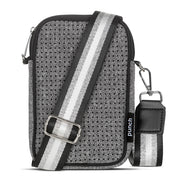 This Grey Punch Neoprene Mini Crossbody Bag is compact and chic, perfect for carrying essentials without the bulk. The punch design adds texture, while the adjustable strap ensures comfort. It is a versatile accessory for any occasion.