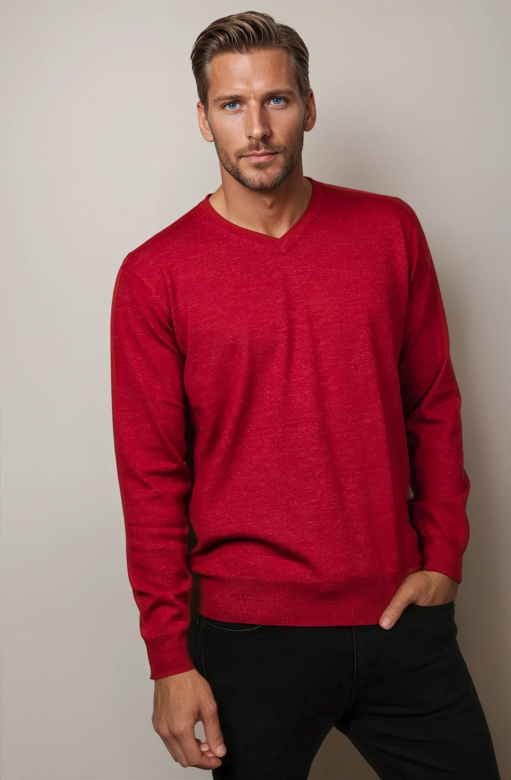 Ansett Red Fine Weight Merino Wool V Neck Jumper