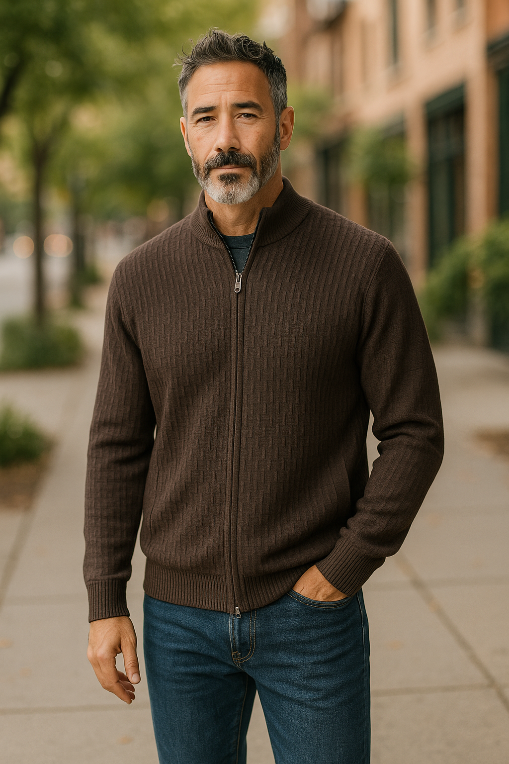 Fine Merino Wool Textured Zip Cardigan - Coffee Brown