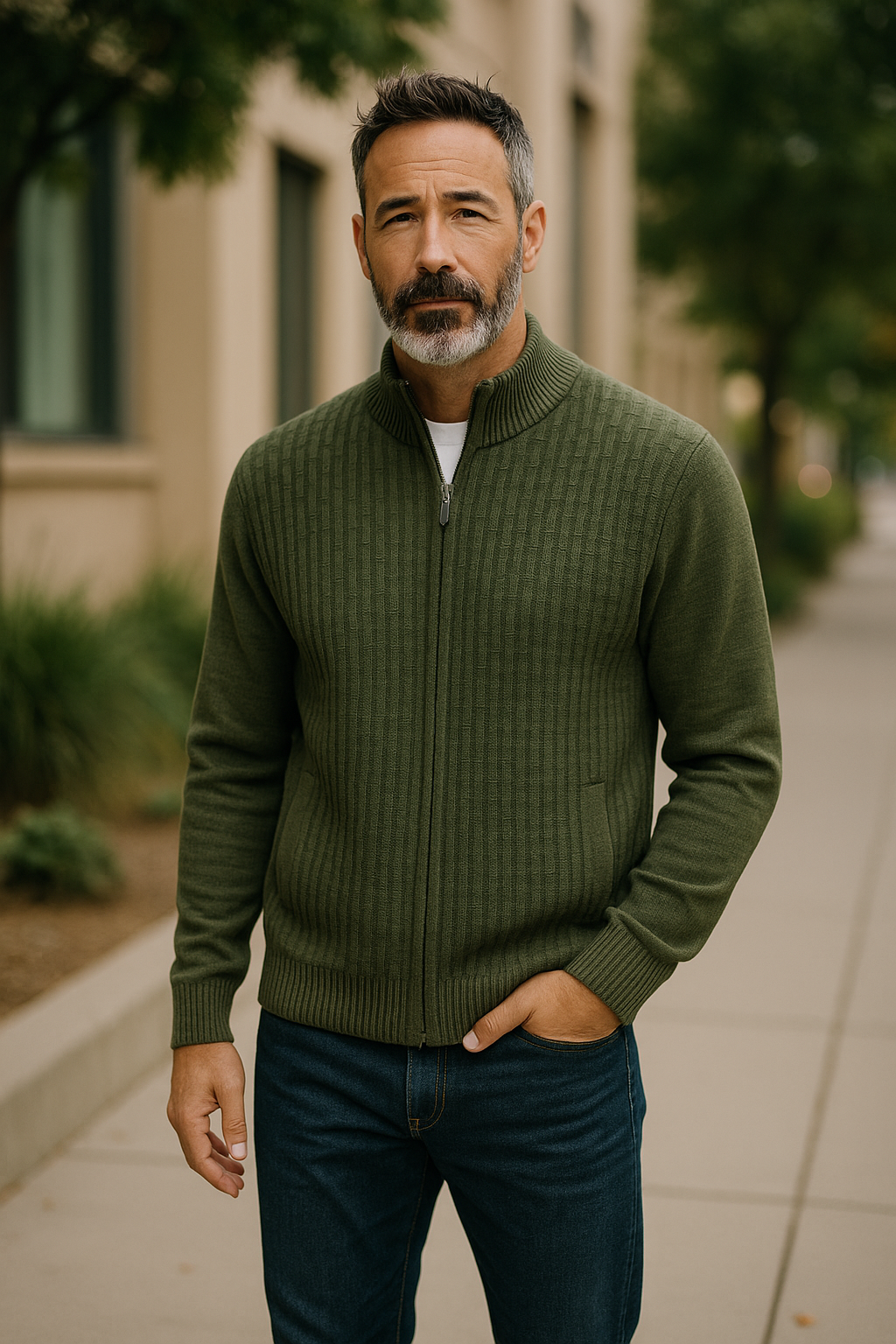 Fine Merino Wool Textured Zip Cardigan - Olive Green
