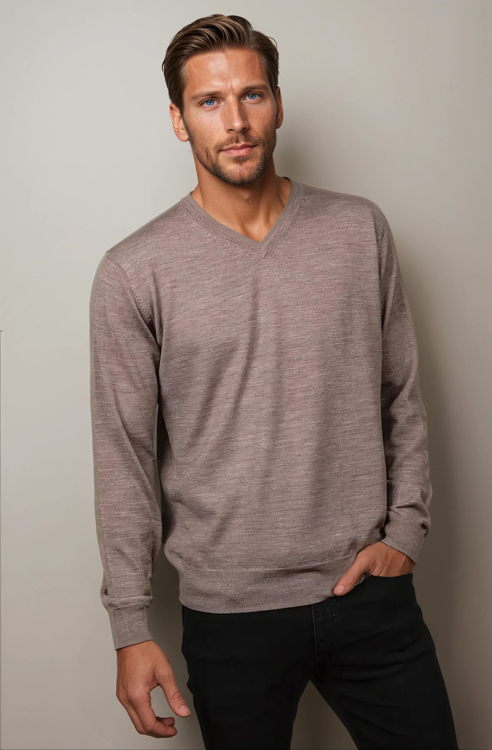 Ansett Mouse Brown Fine Weight Merino Wool V Neck Jumper