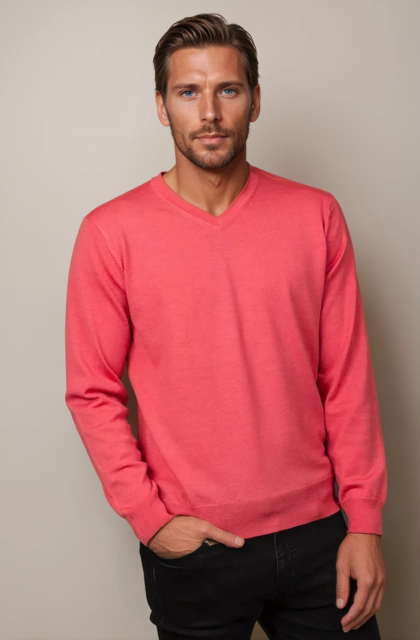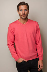 Raspberry Fine Weight Merino Wool V Neck Jumper