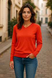 Fine Weight Merino Wool V Neck Jumper - Amber Orange