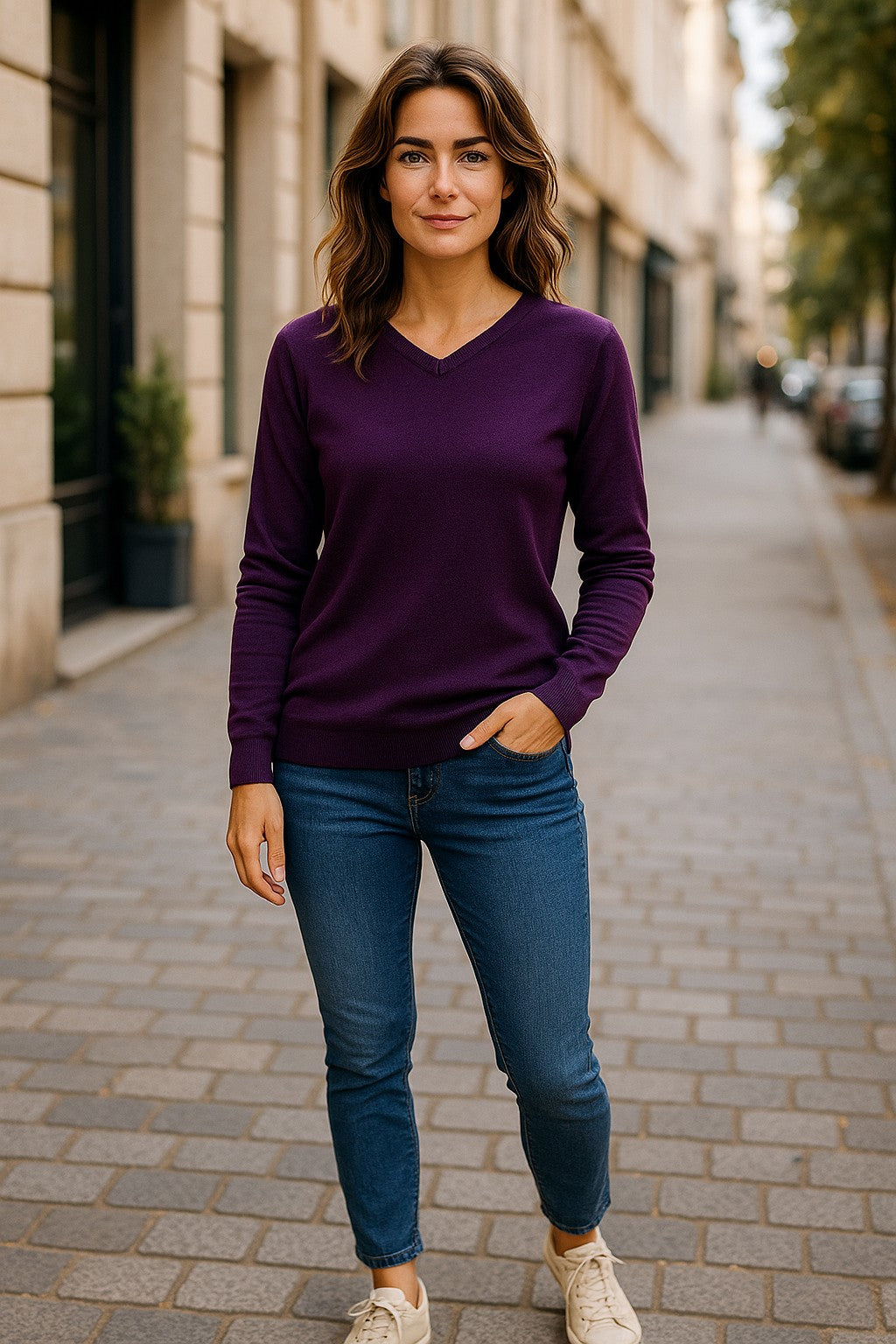 Fine Weight Merino Wool V Neck Jumper - Mulberry Purple