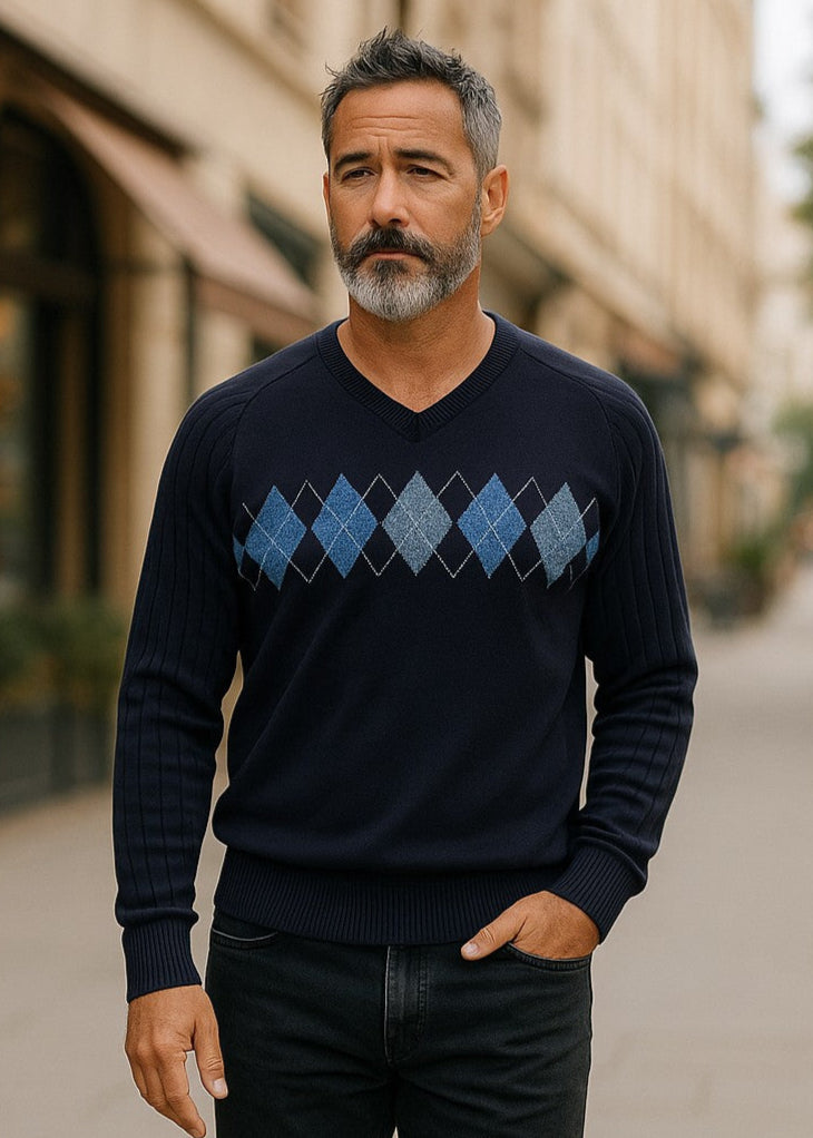9333 Navy Argyle V Neck Jumper - Tradewinds By Ansett