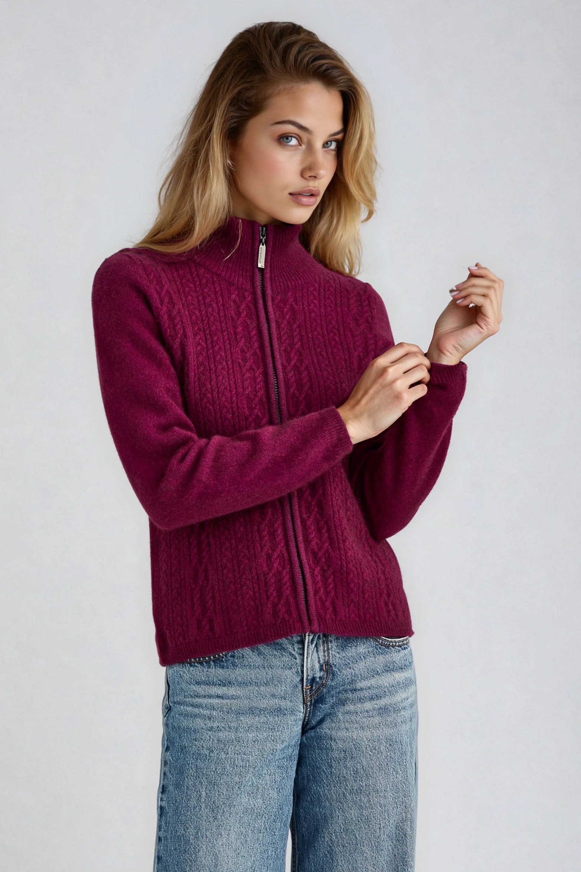 Add a touch of elegance to your wardrobe with the Berry Possum Merino Lace Zip Cardigan. This unique piece features a delicate lace pattern, a full zip front, and is made by mixing possum and merino wool. The mocha hue offers versatility, while the intricate lace design brings a feminine flair to your look. Lightweight yet warm, it’s ideal for both special occasions and everyday sophistication.