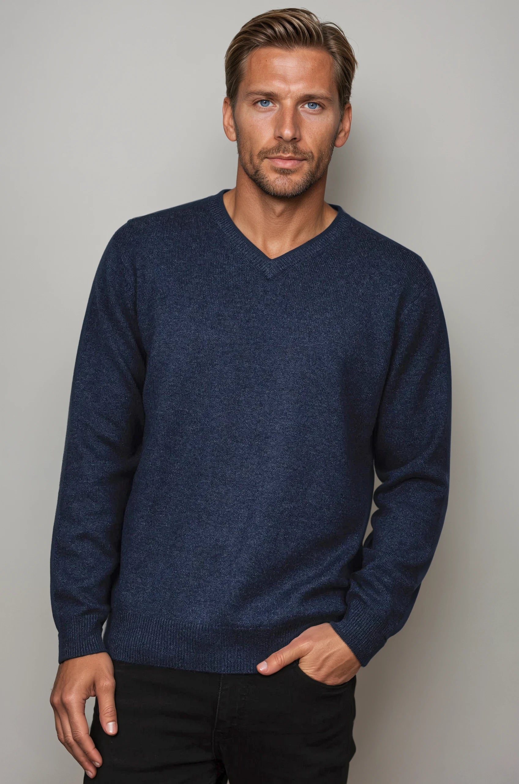 Ansett Denim Blue Cashmere Merino Wool V Neck Jumper