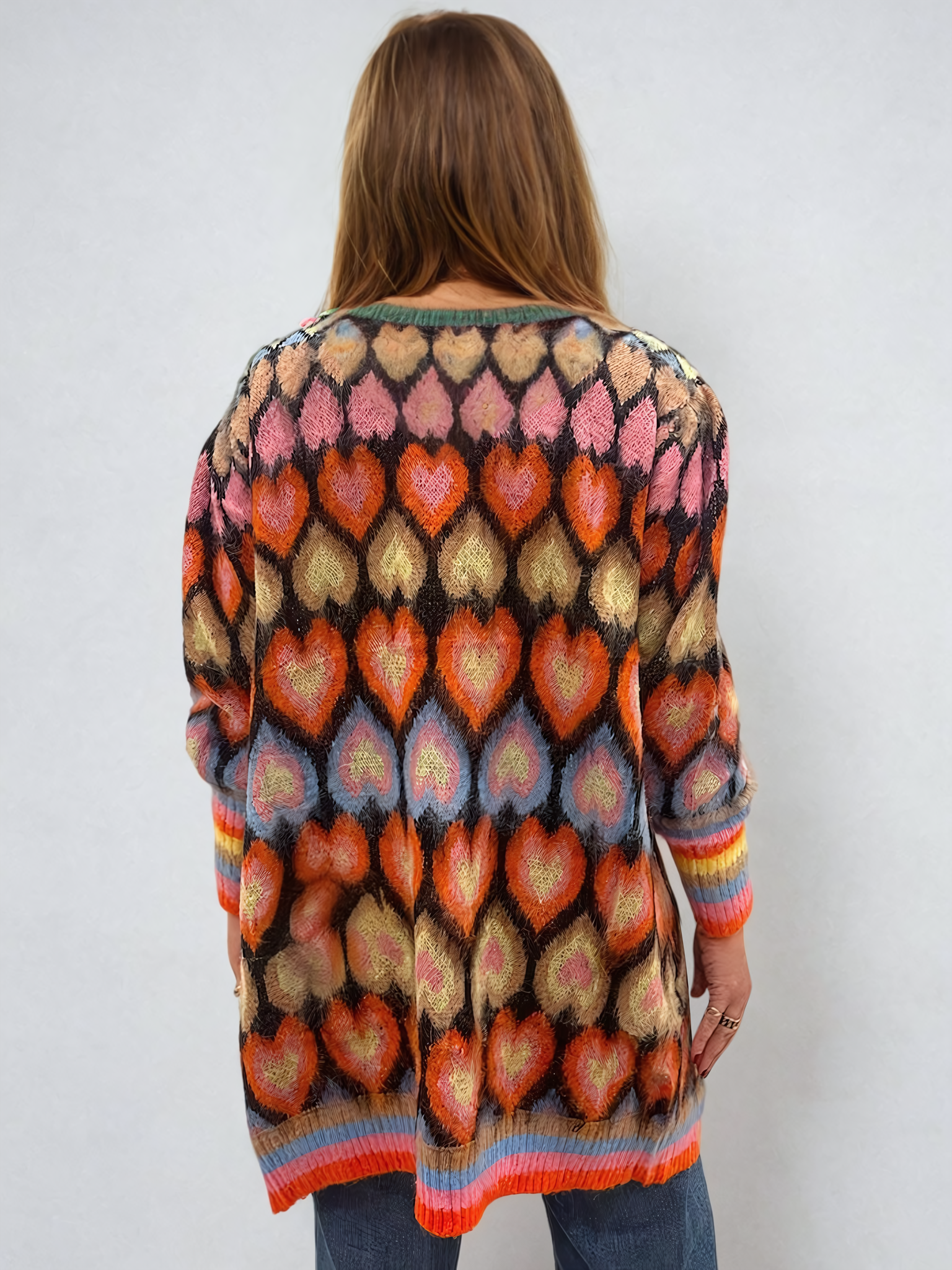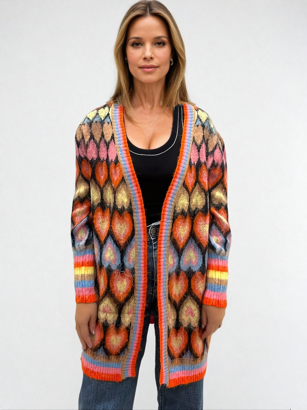 This funky heart patterned, Oversized fluffy cardigan ticks all the right boxes to become your new favourite over-piece this season.