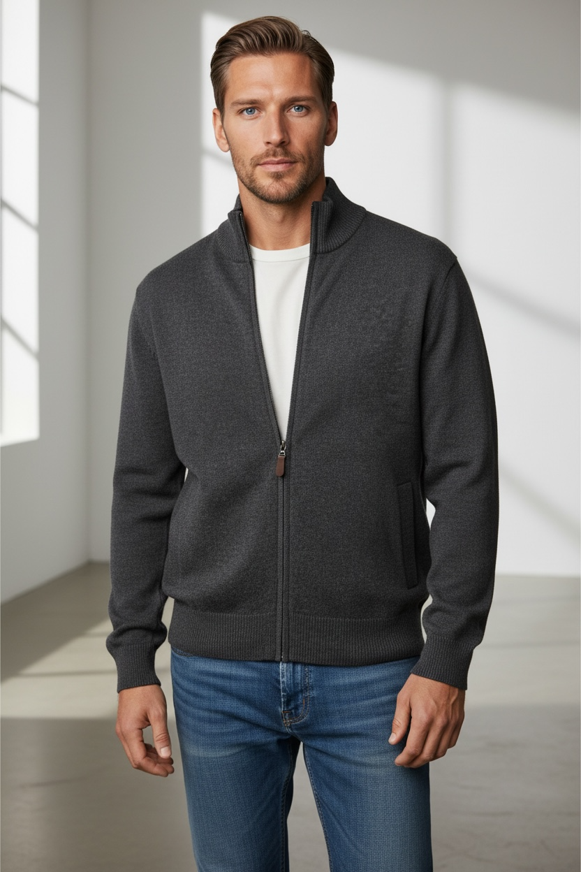 Ansett Men's Cashmere Merino Wool Full Zip Jacket - Charcoal Grey