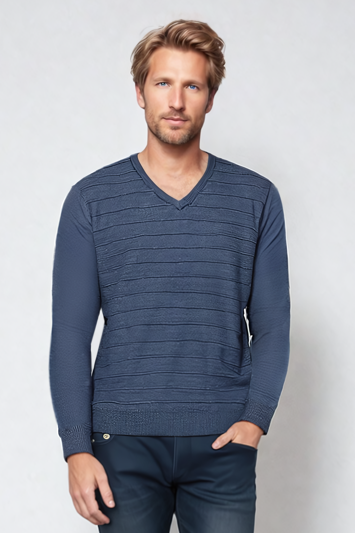 Pure Wool Ansett Patterned V Neck Jumper 8053 Slate Blue