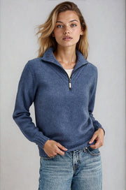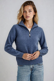 This jumper features a quarter zip and a high collar, offering versatility in style and coverage. The feature rib knit on the neck adds a touch of detail to the design. The combination of merino wool and mulberry silk enhances the garment's softness and luxurious fell. Whether for outdoor activities or everyday wear, this jumper provides both comfort and style. The Mocha colour adds a sophisticated and versatile touch to your wardrobe.