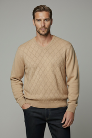Merino Wool Ansett Argyle V Neck Jumper - 8823 Camel